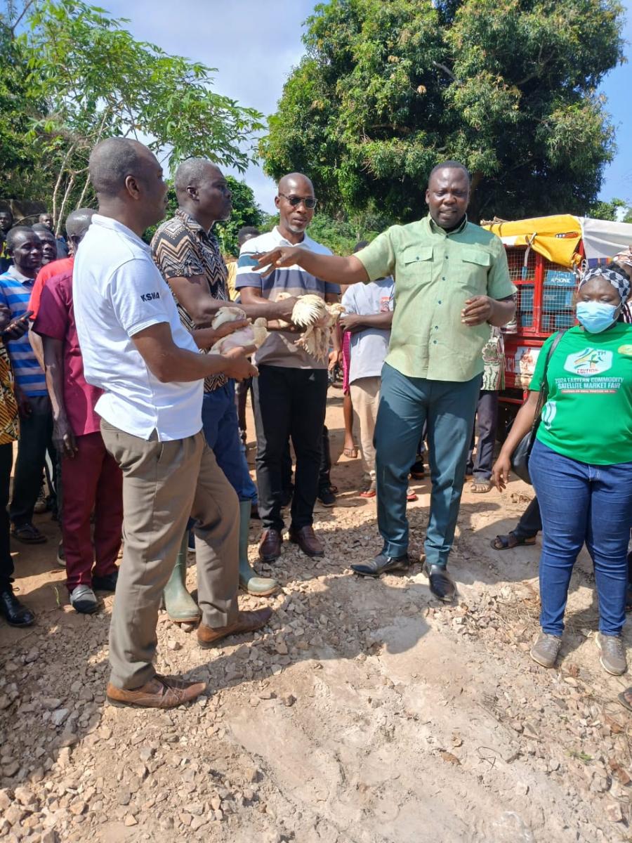 The Municipal Chief Executive, Hon. Effah Osei Bonsu David, led the distribution exercise, overseeing the handover of birds to the eager beneficiaries who had gathered at U-Mart Farms.